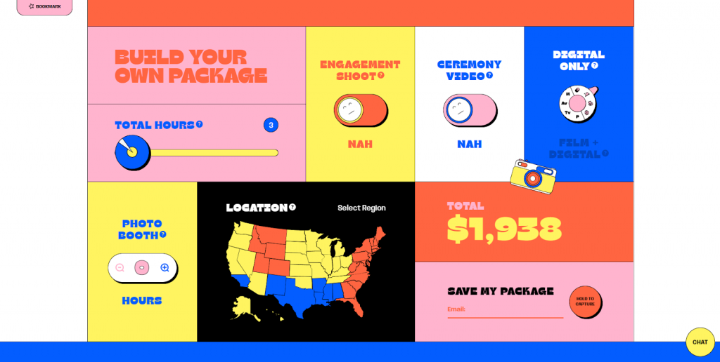 Uno de los elementos esenciales de una página de precios de alto rendimiento es un diseño fácil de usar. Una forma sencilla de hacerlo es utilizar una tabla, columnas o casillas para dividir los paquetes. Otra opción es utilizar una calculadora interactiva como la de Mack & Pouya para que los clientes puedan personalizar y estimar los precios de los paquetes en función de sus necesidades, como el total de horas, los complementos y la ubicación.