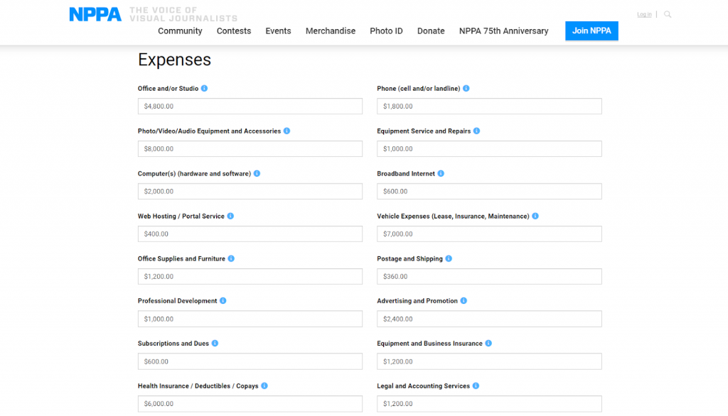 Además de fijarte en los aspectos externos, calcular tus gastos también es importante a la hora de decidir las tarifas de los servicios. La Asociación Nacional de Fotógrafos de Prensa tiene una calculadora muy útil para introducir gastos, como equipo e impuestos, y predecir el precio mínimo que debes ganar.