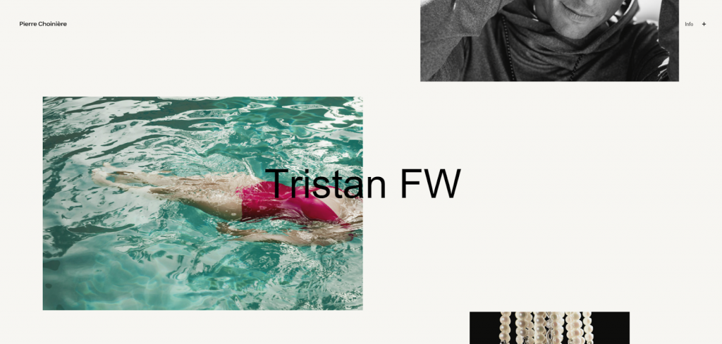 Muchos fotógrafos profesionales adoptan un enfoque más minimalista en sus sitios web de fotografía para que los visitantes presten más atención a las imágenes. Pierre Choiniére utiliza mucho espacio negativo junto con un fondo apagado. Este fotógrafo francés usa múltiples microinteracciones, como tipografía y fotos en movimiento, para añadir un toque dinámico.