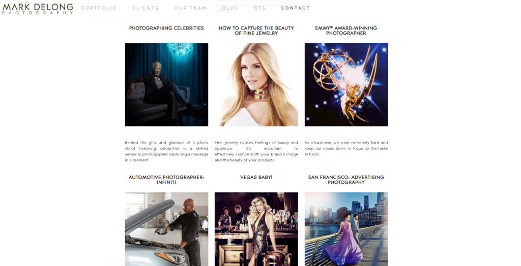 - Escribir contenidos de alta calidad. Crea una sección de blog y comparte contenidos informativos con los visitantes. Esto te ayudará a insertar más palabras clave de forma natural y a adquirir experiencia en el sector. El portfolio digital de Mark Delong es excelente. Publica en su blog tutoriales de fotografía y actualizaciones empresariales, como consejos para fotografiar a famosos y su logro al ganar los premios Emmy.