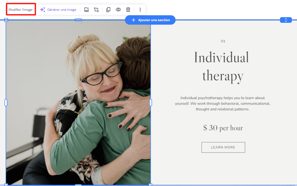 Hostinger simplifie le processus d’ajout et d’affichage de ces images. Pour mieux vous guider, nous utiliserons le modèle Dossenbach comme exemple. Cliquez sur une image existante que vous souhaitez remplacer et choisissez l’option Modifier l’image.