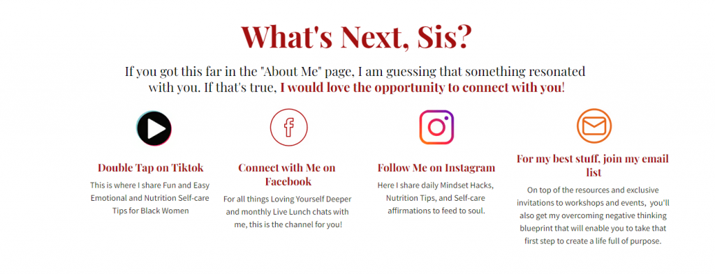 Sur la page “À propos de moi”, Yahudith a ajouté des icônes de médias sociaux à leurs profils. Elle les a rehaussées en ajoutant une courte phrase sur l’utilité de chaque plateforme. Cela aide les clients potentiels à choisir la plateforme qui leur permettra de mieux connaître ce coach en santé.