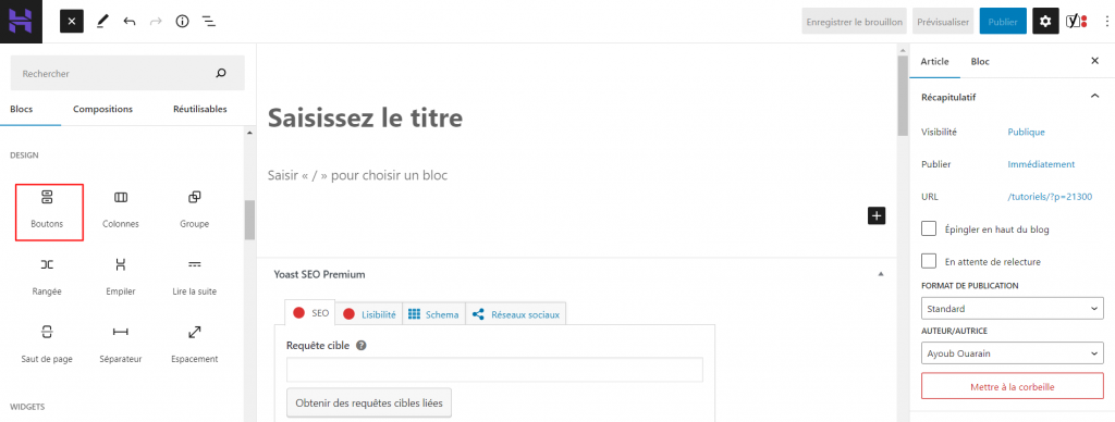 2. Choisissez un bloc pour votre site. Dans cet exemple, nous allons sélectionner le bloc Boutons.