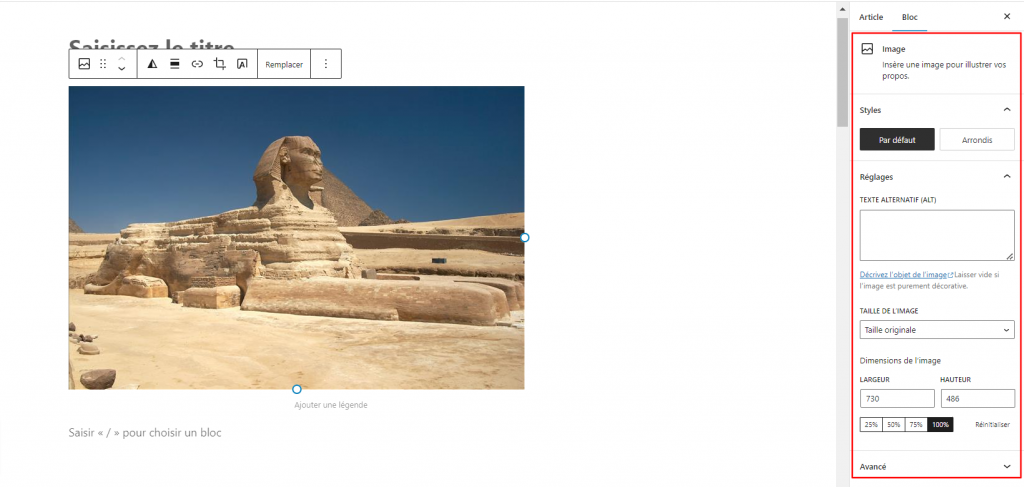 5. Ajustez l’image en utilisant le panneau Réglages de la barre latérale sur le côté droit de l’éditeur de blocs Gutenberg.