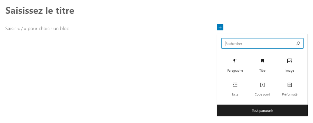 - Cliquez sur l’icône + noire pour sélectionner le premier bloc à ajouter. Si l’élément recherché ne figure pas dans la liste, cliquez sur le bouton Tout parcourir.