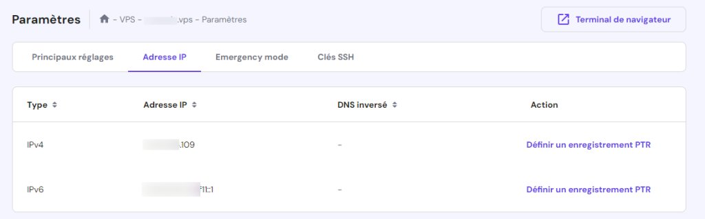 - Cliquez sur l’onglet Adresse IP → Définir un enregistrement PTR.