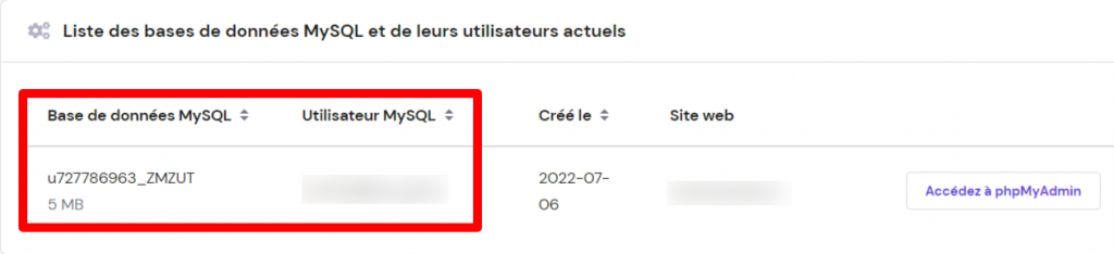 - Dans la section Liste des bases de données MySQL et de leurs utilisateurs actuels, notez le nom de votre base de données MySQL et votre nom d’utilisateur.