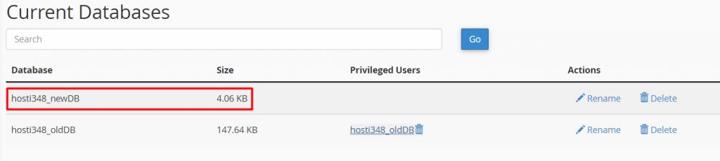 - Faites défiler vers le bas jusqu’à votre nouvelle base de données et cliquez sur Accéder à phpMyAdmin.