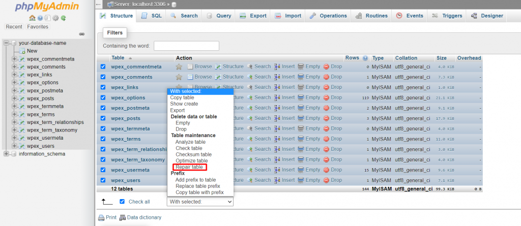 - Sélectionnez votre base de données WordPress dans la liste de gauche.
