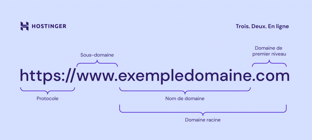 - Un nom de domaine. Il se compose d’un domaine de second niveau et d’un domaine de premier niveau (TLD). Par exemple, dans hostinger.com, “hostinger” est le domaine de second niveau et “.com” est le TLD.