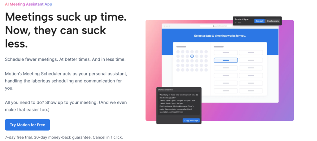 Motion adalah project management tool serbaguna dan kalender yang menyediakan tool penjadwalan bawaan. Fitur Scheduler aplikasi ini bertindak sebagai asisten pribadi, menyiapkan jadwal meeting dan berkomunikasi atas nama Anda menggunakan AI. Lebih kerennya lagi, Motion akan terus menyesuaikan sistemnya berdasarkan tugas-tugas baru.
