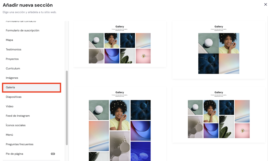 Además, puedes añadir una galería de fotos a tu página de portafolio. Ve a la sección en la que quieras que esté la galería y haz clic en Añadir sección.