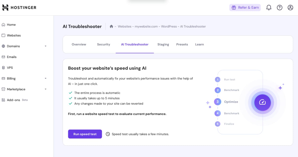 This new AI Troubleshooter functionality will automatically optimize your WordPress website’s performance. The tool detects slow-performing areas of the website and applies the most effective optimization settings to improve speed. It also allows you to compare performance before and after the changes, with the option to revert the optimizations if needed.