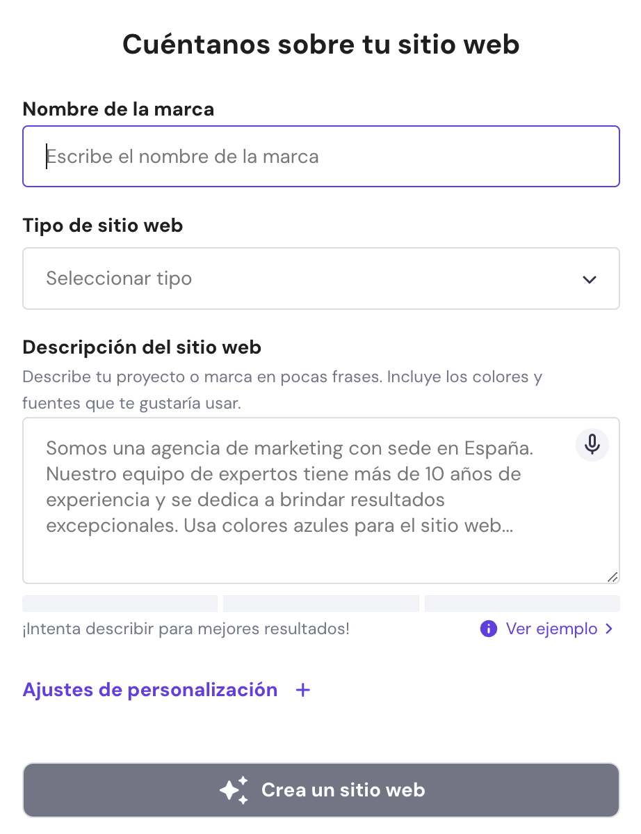 - Introduce los datos de tu marca y el tipo de sitio web. Sé tan descriptivo como puedas para ayudar a la IA a entender tus necesidades. Amplía los Ajustes de personalización para establecer tu estilo y paleta de colores preferidos. Cuando hayas terminado, pulsa Crear un sitio web.