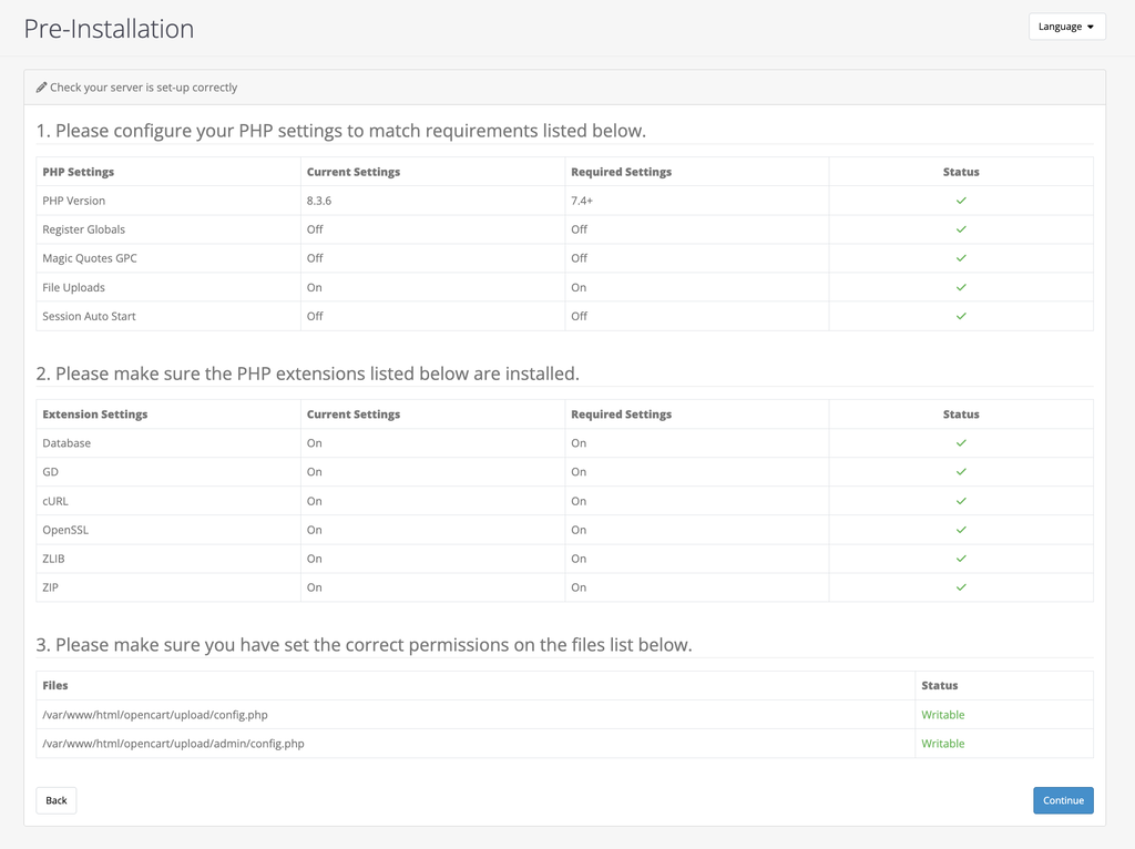- El asistente verificará si tu VPS cumple los requisitos técnicos de OpenCart. Resuelve cualquier problema que aparezca en la lista antes de continuar. De lo contrario, pulsa Continuar.