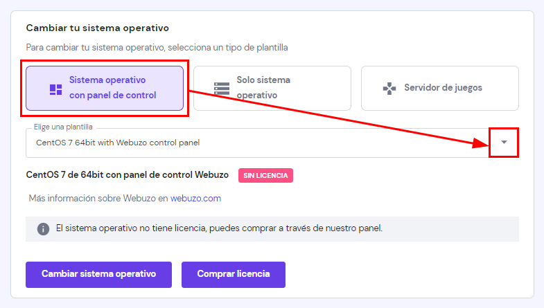 Como Plesk se basa en licencias, debes comprar el panel de control antes de instalarlo en tu VPS. En Hostinger, puedes instalar y comprar la licencia del panel de control directamente desde el menú de configuración del sistema operativo de tu VPS.