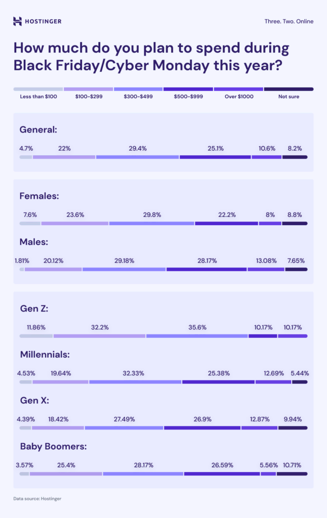 Hostinger’s 2024 study surveyed 1,000 US consumers about their Black Friday and Cyber Monday shopping preferences, spending habits, and product interests. Although collected in 2024, this data provides historical context that complements current industry trends in 2025.
