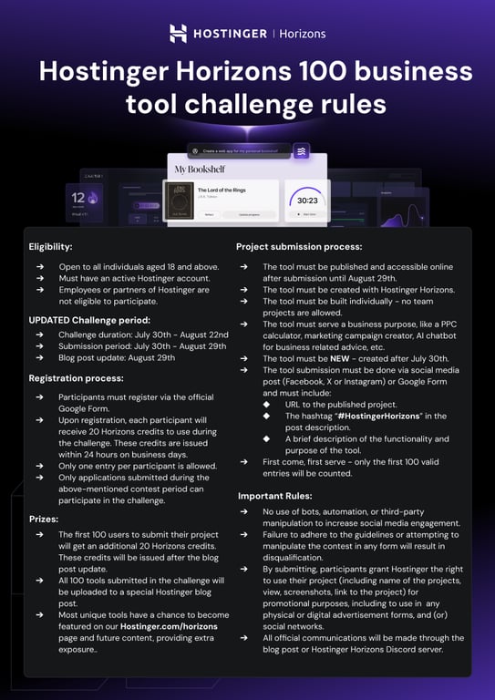 Ready, set, go! Hostinger invites you to participate in the Hostinger Horizons Business Tool Challenge and create unique tools for businesses to use. This is your chance to get noticed and make a difference online. Create and submit your business tool to join the exclusive 100 showcased on our blog.