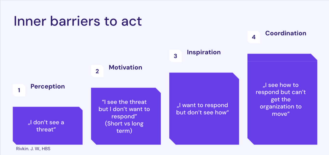 Through surveys and one-on-one conversations, we observed that people experience change differently. Some embrace it with enthusiasm; others approach it with more caution — both natural responses to unfamiliar situations. Harvard Business School professor J.W. Rivkin’s research on “internal barriers to act” – perception, motivation, and coordination – explains what we witnessed firsthand. Not everyone feels the same urgency or recognizes opportunity at the same pace, which is making guiding change both complex and deeply human.