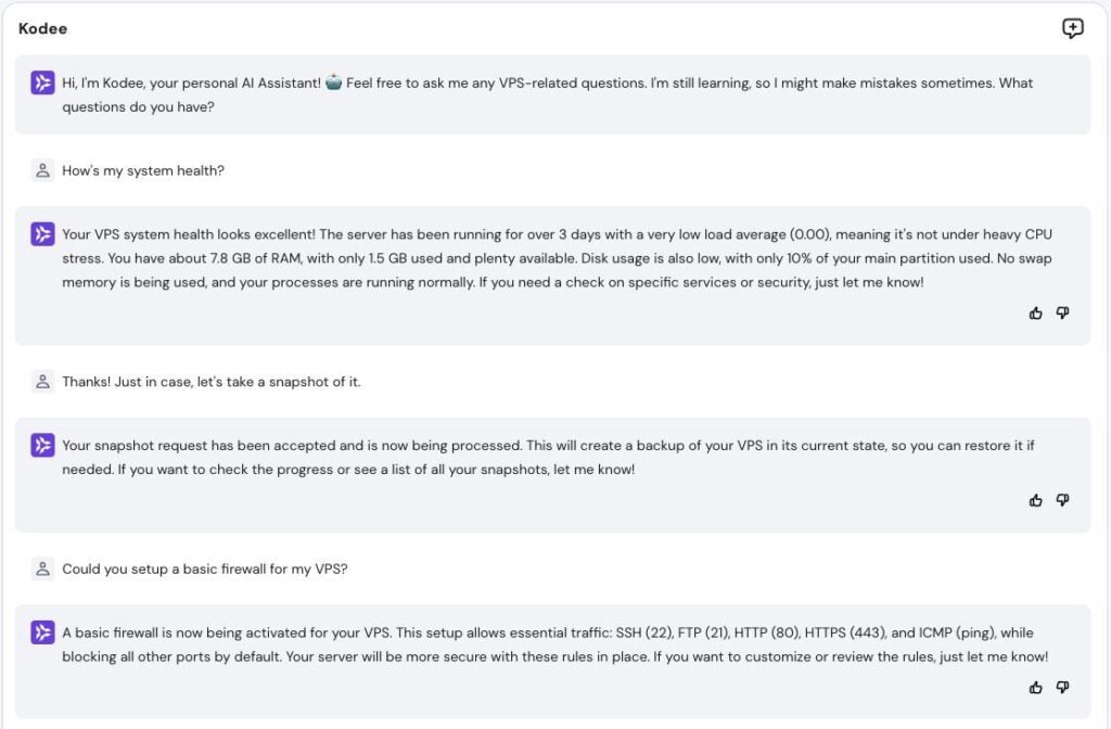 - Kodee nudges. Get guidance, discover relevant actions, and manage your VPS more effectively with Kodee, your AI-powered server admin. Look for AI sparkles across your dashboard to see contextual prompts and suggestions exactly when and where they’re most useful.