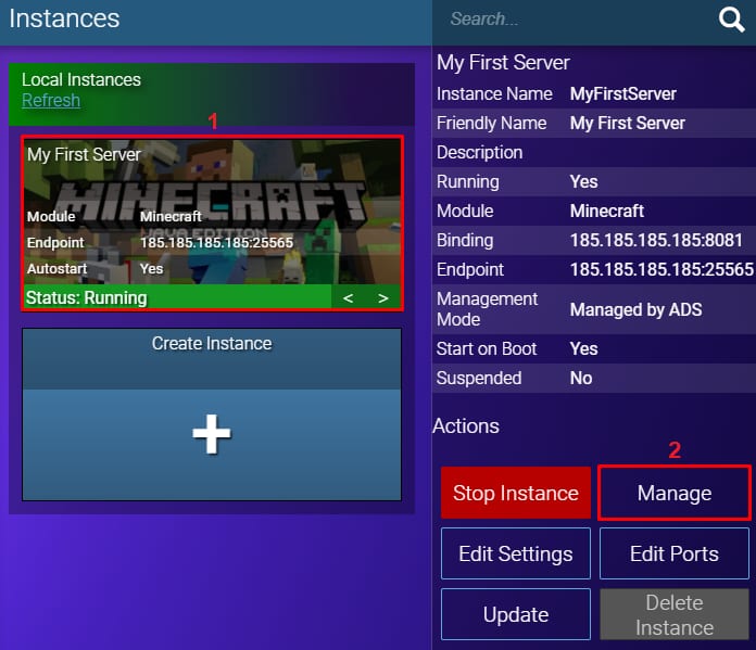 Concluída a configuração do servidor, clique na sua instância e selecione Manage (gerenciar):
