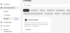 Para começar, acesse o painel do seu VPS e vá até Gerenciador Docker → Catálogo. Procure por Hermes Agent e clique em Selecionar. Durante a implantação, você precisará informar uma chave de API de um provedor de LLM, como OpenRouter, Anthropic ou OpenAI. Essa chave permite que o Hermes interaja com modelos de linguagem e execute tarefas.