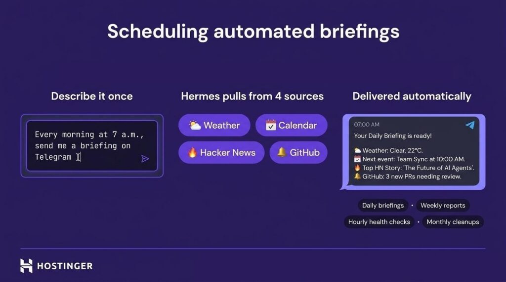 O Hermes Agent pode executar fluxos de trabalho autônomos usando um cron planner embutido. Você descreve a programação em linguagem natural, e os resultados aparecem no canal que você conectou.