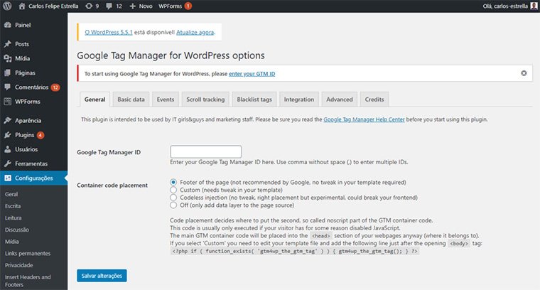 Então, no seu site do WordPress, vá para Configuraçoes -> Google Tag Manager e cole na caixa Google Tag Manager ID.