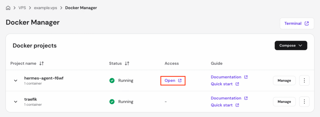 Quando a instalação terminar, vá para o Docker Manager → Projetos e abra o terminal web do Hermes Agent da mesma forma.
