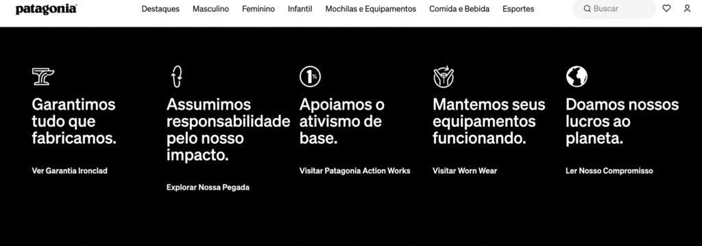 Da mesma forma, a Patagonia vai além de jaquetas e equipamentos para atividades ao ar livre. As pessoas compram Patagonia não apenas pela qualidade dos produtos, mas porque a marca incorpora responsabilidade ambiental e aventura.
