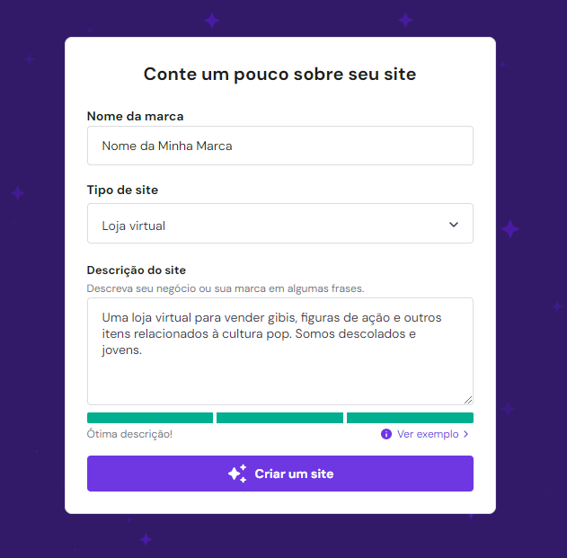 Para construir o site com IA, clique no botão Começar a criar. Escreva o nome da sua marca, tipo de site e uma descrição. Quanto mais detalhada for a sua descrição, melhor a IA pode entender suas necessidades e criar um site adequado para você.