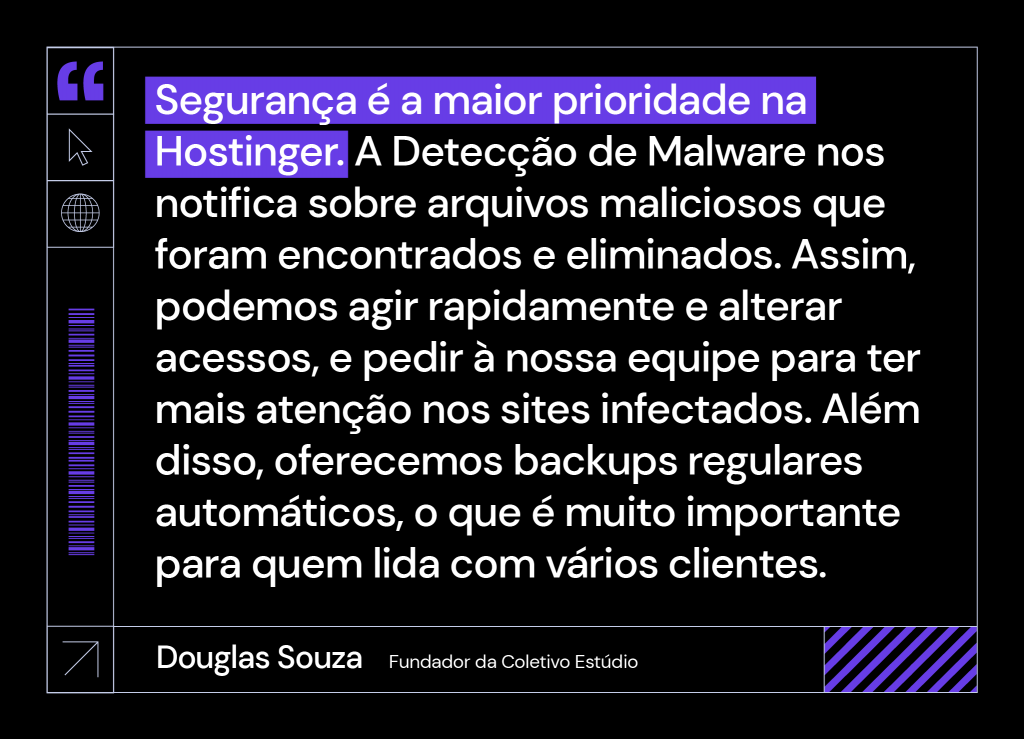 “A segurança mudou imediatamente após a mudança para a Hostinger, e isso nos convenceu a migrar todos os nossos clientes”, compartilhou Douglas.