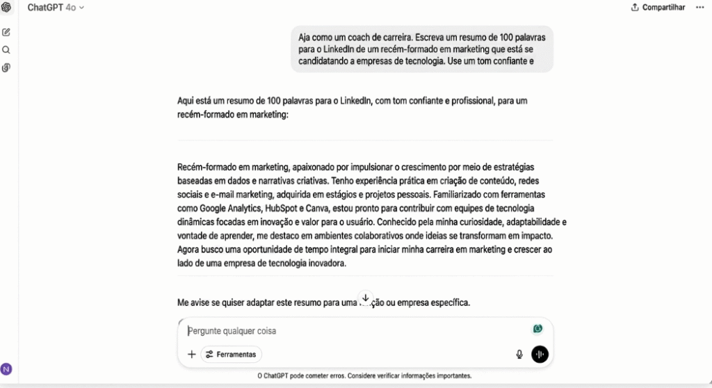 Isso é especialmente valioso se você está buscando um cargo de engenheiro de prompt freelancer ou construindo sua carreira como engenheiro de prompt.