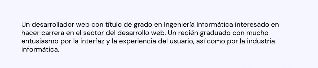 El ejemplo anterior muestra la educación y el interés del candidato en el área. Aún así, puede que no sea lo suficientemente convincente para los reclutadores, ya que no muestra las habilidades y la experiencia en desarrollo web del candidato.