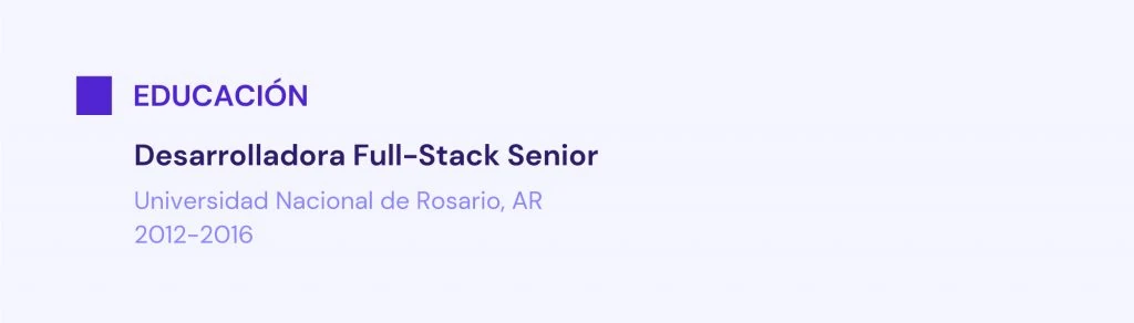 A continuación, para la sección de educación para desarrolladores web, incluye el título, el nombre de la universidad y el período de estudio, como en este ejemplo a continuación:
