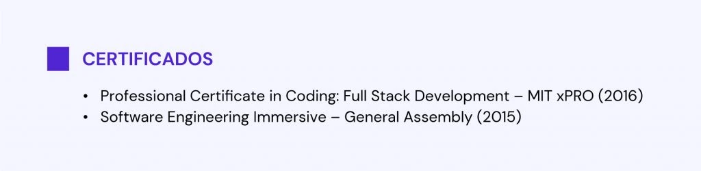 Además, ten en cuenta que esta sección solo debe ser para habilidades técnicas, por lo que no incluyas habilidades blandas aquí. Si tienes certificaciones de desarrollador web relacionadas con las habilidades técnicas que has enumerado, no dudes en mostrarlas en una sección de certificación para que sirvan como prueba de esas habilidades.