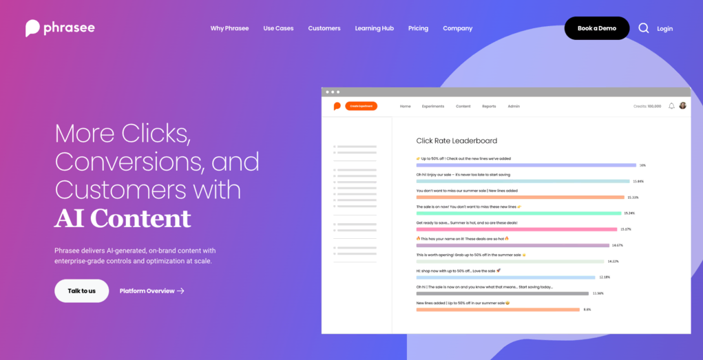 Ya sea escribiendo líneas de asunto de correo electrónico, subtítulos de redes sociales o notificaciones automáticas, la redacción con IA de Phrasee puede ayudar a transformar el rendimiento de tu campaña. Esta herramienta impulsada por IA genera un lenguaje de marca que resuena con tu público objetivo, ayudándote a brindarles a los clientes experiencias más personalizadas.