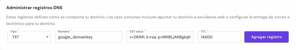 - Añade el registro generado por Google en Administrar registros DNS. El servidor receptor puede utilizar esta clave para verificar tus mensajes.