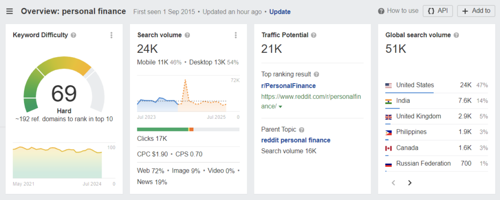 Verwenden Sie Keyword-Recherche-Tools wie Ahrefs, um weniger wettbewerbsfähige Affiliate-Marketing-Nischen mit gutem Traffic-Potenzial zu finden. Öffnen Sie einfach die Registerkarte Keyword Explorer und geben Sie die gewünschte Nische ein. Hier ist ein Beispiel für das Keyword Personal Finance.