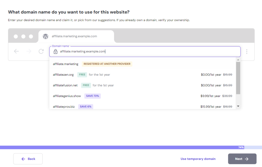 - Geben Sie Ihren gewünschten Domainnamen ein und sichern Sie ihn. Wenn die Webadresse nicht verfügbar ist, wählen Sie stattdessen aus unseren Vorschlägen.