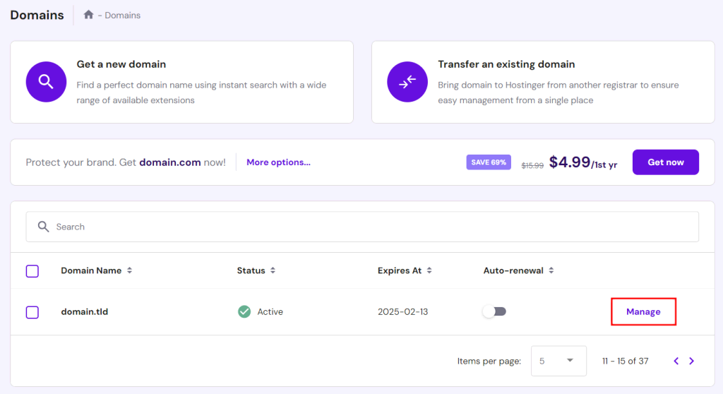 - Klicken Sie auf Verwalten neben der Domain, die Sie verlängern möchten.
