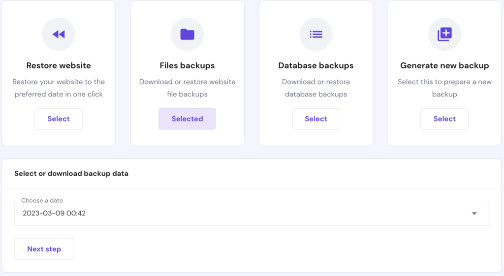 Wenn Sie darauf klicken, werden verschiedene Arten von auf dem Server gespeicherten Backups angezeigt. Wenn Sie WordPress oder ein anderes Content Management System (CMS) verwenden, müssen Sie sowohl Ihre Website-Dateien als auch die MySQL-Datenbank wiederherstellen.