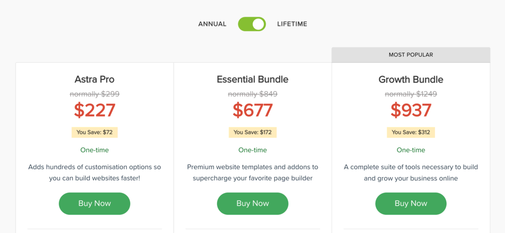 Werfen Sie zum Beispiel einen Blick auf die Preisgestaltung von Astra Pro. Es gibt drei Pläne – einen Basisplan für Astra Pro und zwei zusätzliche Pläne, die Add-ons für den Page Builder und Plugins enthalten. Diese Pläne werden sowohl als lebenslange Lizenz als auch als Jahresabonnement angeboten.