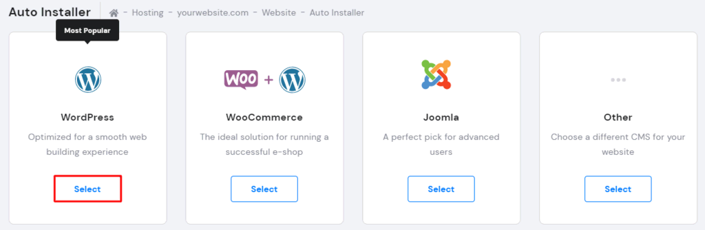 Wenn Sie das hPanel von Hostinger verwenden, navigieren Sie einfach zu Website → Auto-Installer und wählen Sie WordPress. Sie müssen die Anmeldedaten eingeben und die zu installierende WordPress-Version auswählen. Achten Sie darauf, dass Sie die neueste verfügbare WordPress-Version auswählen.