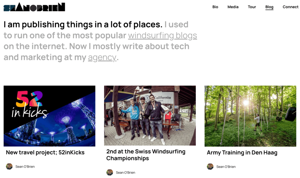 Sean O’Brien ist ein Windsurfer, der weltweit Meisterschaften gewonnen hat. Er gibt die Informationen auf der Startseite im sofort sichtbaren Bereich an, sodass Besucher sofort wissen, wer er ist.