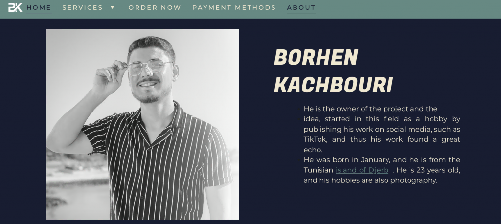 Die Seite von Borhen Kachbouri ist ein hervorragendes Beispiel dafür, wie man einen effektiven Über-uns-Abschnitt gestaltet. Die Seite ist einfach und leicht zu navigieren und ermöglicht den Besuchern der Webseite, Kachbouris persönliche Geschichte im Grafikdesign schnell zu verstehen.