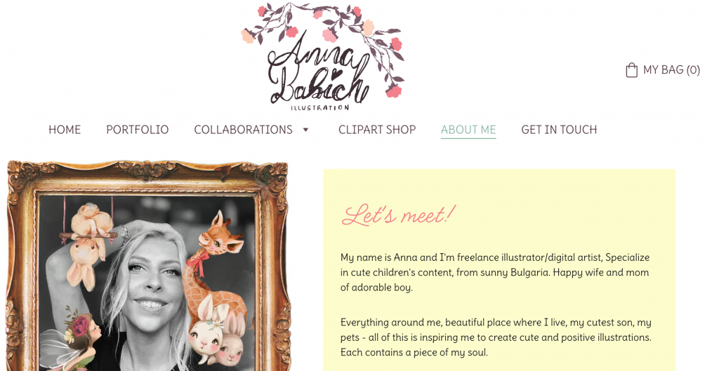 Wichtige Elemente wie ihr Geschäftsmodell, Zielkunden und Nische – Kinder-Illustrationen – werden klar angegeben, was diese effektive und ansprechende Über-Mich-Seite abrundet.