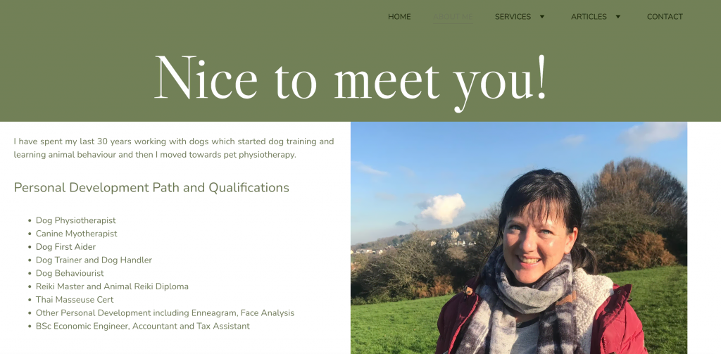Die Seite hebt effektiv die einzigartigen Qualifikationen und Dienstleistungen der Gründerin hervor, ohne auf aggressive Verkaufstaktiken zurückgreifen zu müssen. Dies kann ein wichtiges Element für ihr Zielpublikum sein, das wissen möchte, dass ihre Haustiere in sicheren und fähigen Händen sind.