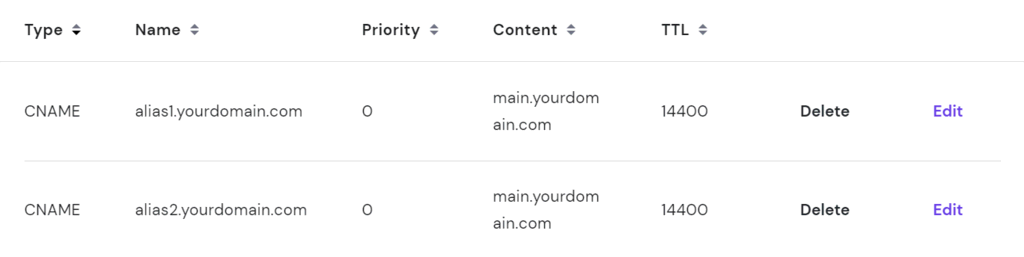Sie möchten zum Beispiel, dass Ihre Subdomains alias1.ihredomain.com und alias2.ihredomain.com auf main.ihredomain.com verweisen. Das Hinzufügen eines CNAME-Eintrags für jede Alias-Domain erfüllt diese Aufgabe.