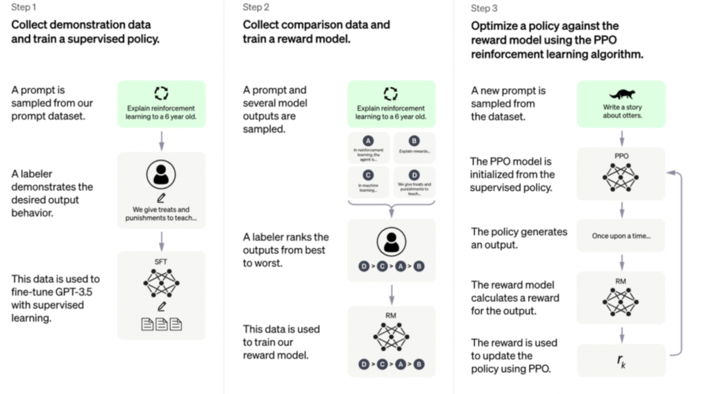 Der Unterschied zu OpenAI besteht darin, dass ChatGPT mit der Methode des Reinforcement Learning from Human Feedback (RLHF) trainiert wird. Sie bezieht menschliches Feedback ein, um die Antworten auf der Grundlage ihrer Qualität zu messen und einzustufen.